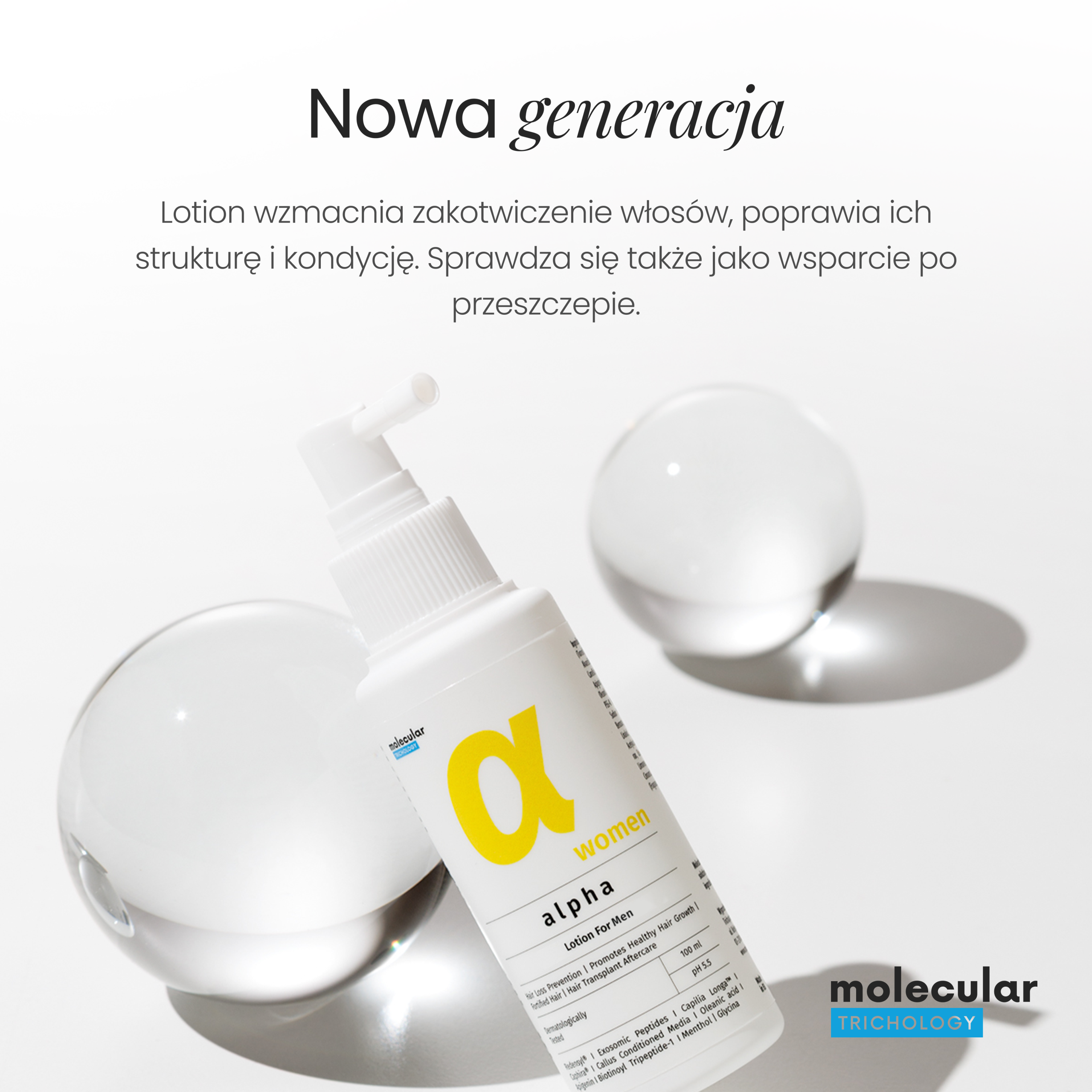 Molecular Trichology Alpha Hair Loss Prevention Lotion for Men to zaawansowany preparat przeznaczony do codziennej pielęgnacji skóry głowy, stworzony z myślą o mężczyznach borykających się z nadmiernym wypadaniem włosów. Formuła lotionu oparta jest na synergii działania Redensylu® i Capalgin™, które skutecznie wspierają procesy regeneracyjne w obrębie mieszka włosowego i stymulują wzrost nowych włosów.