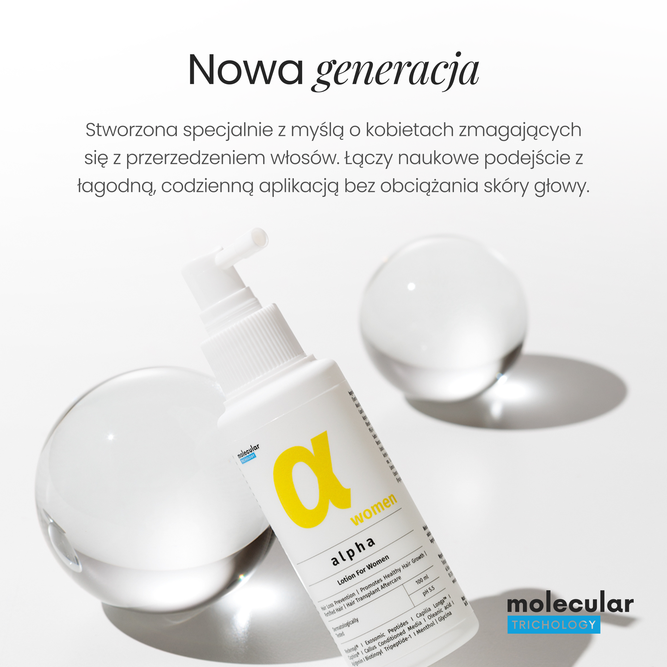 Molecular Trichology Alpha Hair Loss Prevention Lotion for Women to zaawansowany preparat przeznaczony do codziennej pielęgnacji skóry głowy, stworzony z myślą o osobach borykających się z nadmiernym wypadaniem włosów. Formuła lotionu oparta jest na synergii działania egzosomów, Redensylu® i Capilia Longa, które skutecznie wspierają procesy regeneracyjne w obrębie mieszka włosowego i stymulują wzrost nowych włosów.