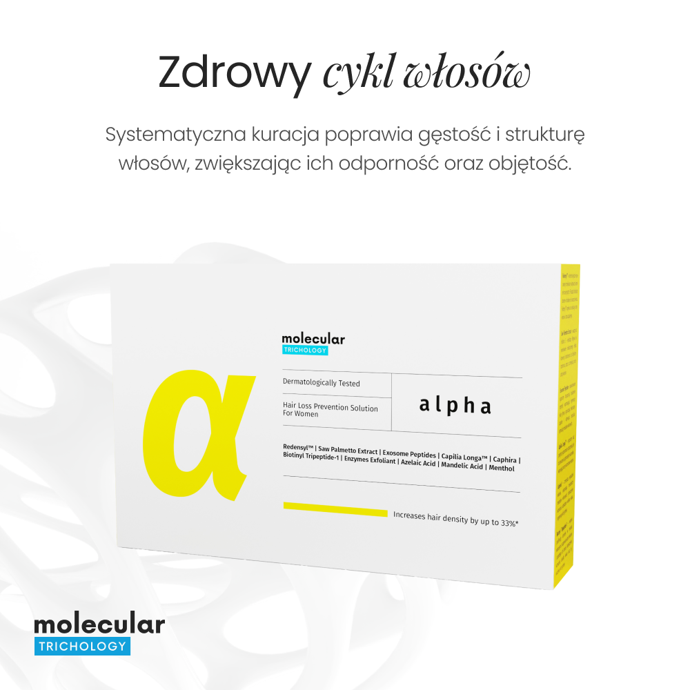 Alpha Hair Loss Prevention Solution for Women to zaawansowana kuracja trychologiczna, opracowana dla kobiet borykających się z problemem nadmiernego wypadania włosów. Jej formuła bazuje na najnowszych osiągnięciach naukowych i zawiera precyzyjnie dobrane składniki aktywne, które skutecznie wspomagają wzrost nowych włosów oraz ograniczają ich utratę.