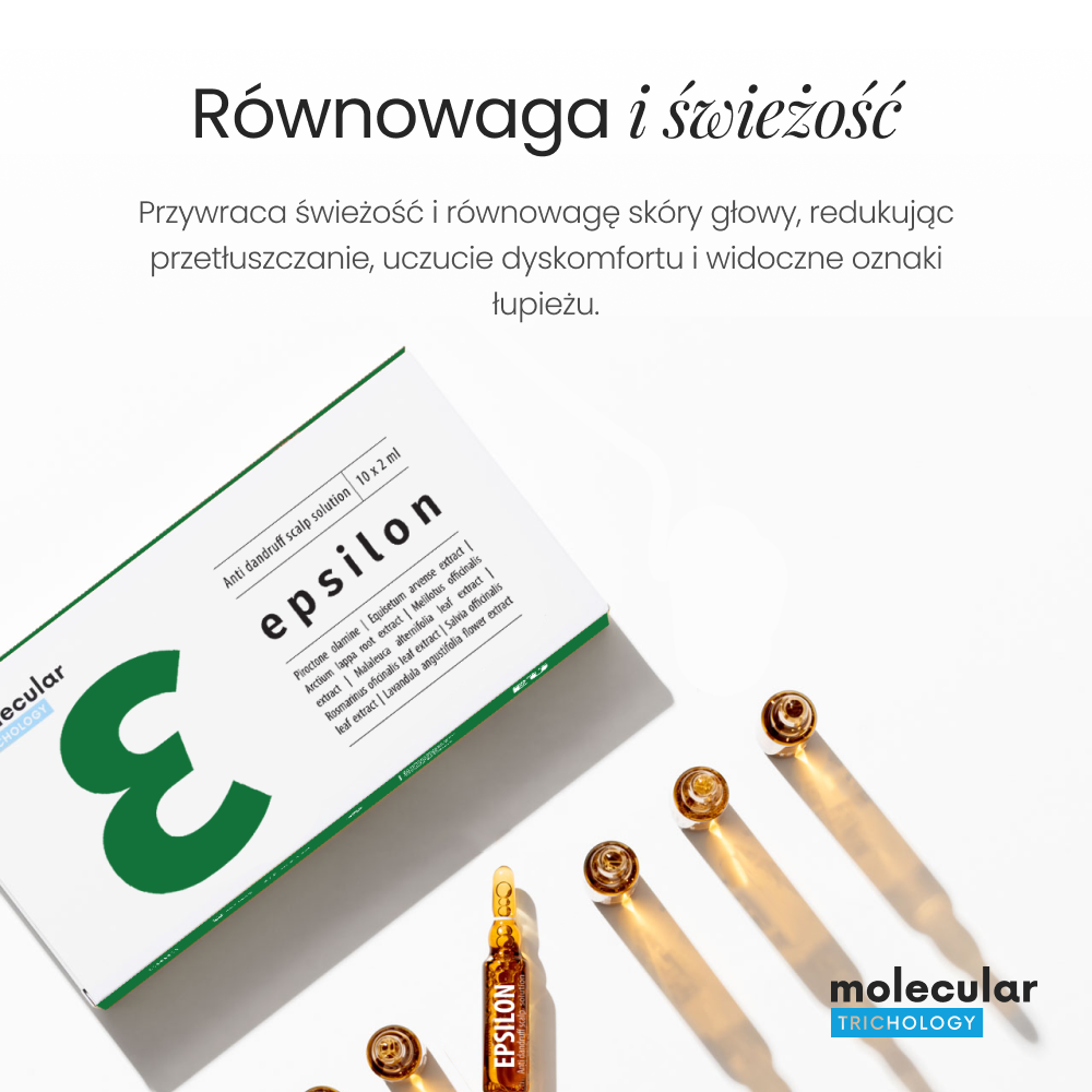 Molecular Trichology Epsilon Dandruff Scalp Ampułki z Serum to zaawansowana kuracja trychologiczna stworzona z myślą o skutecznej pielęgnacji skóry głowy dotkniętej łupieżem, łuszczycą i łojotokowym zapaleniem skóry (ŁZS). Ich unikalna formuła opiera się na składnikach aktywnych o właściwościach przeciwłupieżowych, przeciwzapalnych i regulujących mikrobiom skóry.