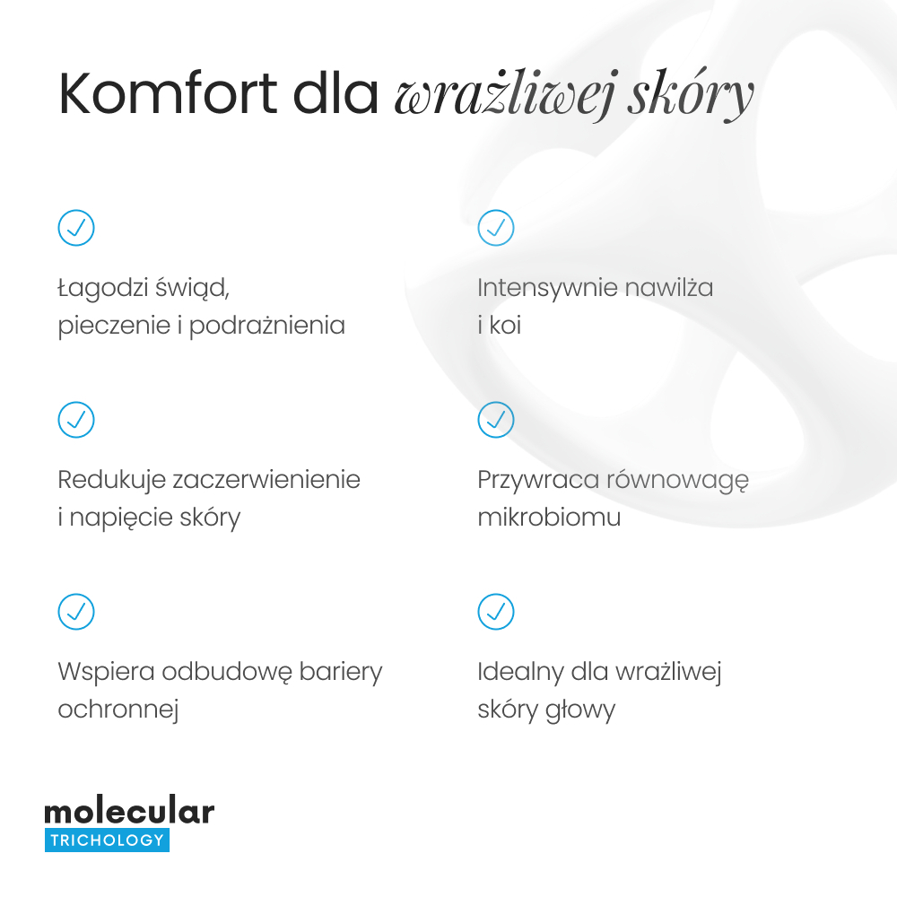 • Łagodzenie podrażnień i nadwrażliwości – formuła intensywnie nawilża i koi skórę głowy, redukując uczucie swędzenia, suchości i dyskomfortu
