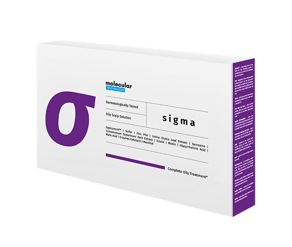 Molecular Trichology Sigma Oily Scalp Solution to zaawansowana kuracja trychologiczna dla osób z nadmiernie przetłuszczającą się skórą głowy. Formuła produktu skutecznie reguluje wydzielanie sebum, łagodzi podrażnienia i przywraca równowagę mikrobiomu, zapewniając długotrwałą świeżość i komfort. Dodatkowo wspomaga oczyszczanie skóry głowy, redukując nadmiar łoju i zanieczyszczenia.